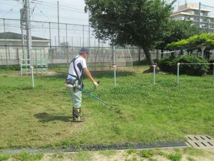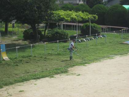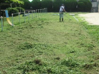 真夏の日差しを浴びてたくましく育つのは子ども達ばかりではありません。雨が降って日が長くなるこの時期は、学校の樹木の葉は青々と茂り、芝生の草もグングン伸びます。木々や草花も成長しているのですが、きちんと手入れをしないと児童が遊ぶときに引っかかったり転んだりすることもあります。また伸び放題の草むらには害虫なども発生しやすくなります。