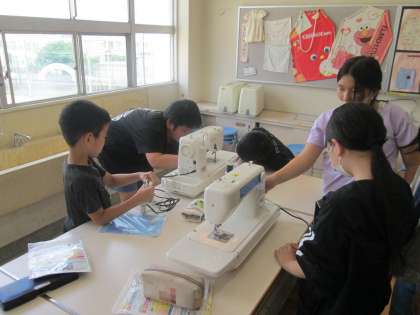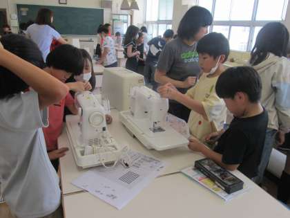 その自然体験学習で使うナップザックは、5年生が家庭科の授業で作ったものを持っていきます。2学年での活動が多い十三小学校では、例年、6年生がナップザックを作った経験を活かして、5年生にミシンの使い方を教えています。