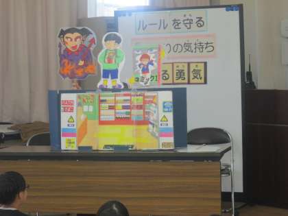 大阪市では毎年、小学生や中学生が万引きで補導される事案が多いそうです。『非行防止教室』の後半は、ピース君という男の子がマンガが欲しいという誘惑に悩む劇を、ペープサートで見せていただきました。