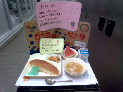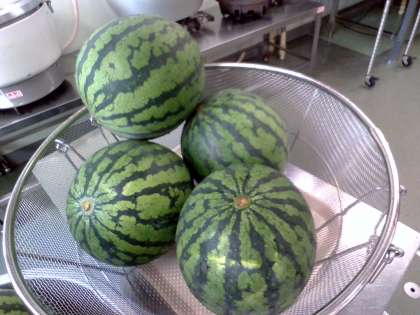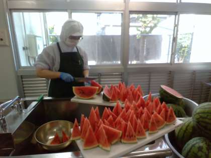 今日は「パエリア、ウインナーとキャベツのスープ、すいか、コッペパン、りんごジャム、牛乳」でした。パエリアには年に一度の赤ピーマンが入りました。カレーー風味で人気がありました。そして、今日はデザートにすいかが登場しました。一玉は64人分になるように、真ん中の甘い部分がみんなに当たるように切りました。すいかに苦手な児童もいましたが、「あま〜い」「おいしい〜」「皮も食べていい?」夏のすいかを楽しく食べていました。