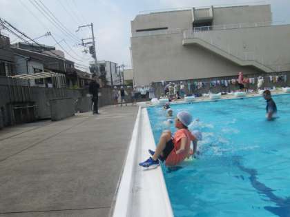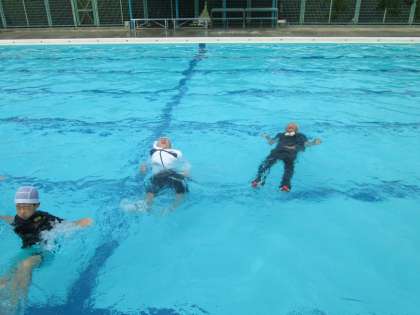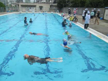 先生のお手本のマネをして、体中の力を抜いて水面に浮かぶ体験をしました。またペットボトルを浮き具にして、シャツの中に入れたり胸の上で抱えたりして浮力を得る練習をしました。