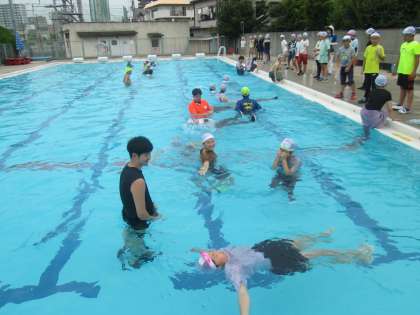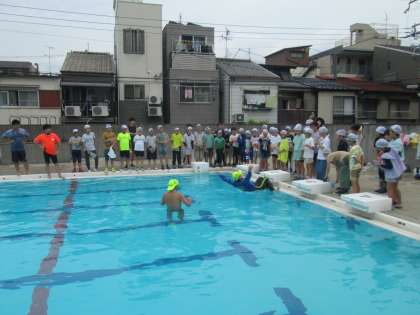 5年生・6年生の授業にはNPОプールボランティアから講師の方をお招きし、「落水時における浮き方体験学習」の指導をしていただきました。