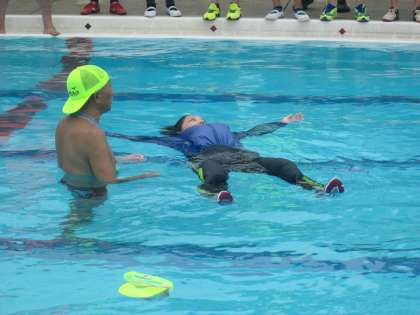 準備運動と水慣れの後、さっそく衣服を着てクツをはいて集まります。講師の先生演じる落水の様子を観察すると、衣服の中に空気が入ったりスニーカーが浮かんだりしているのがよくわかります。