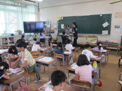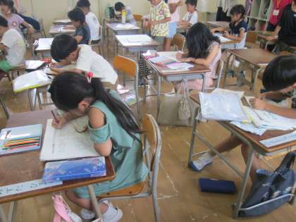 教室では担任先生が「夏休みのくらし」を配っていました。たくさんのプリントが綴られていて、ページをめくると言葉を書く練習や足し算と引き算の問題があります。初めてもらった夏休みの宿題を見ても1年生の子ども達は嬉しそうです。