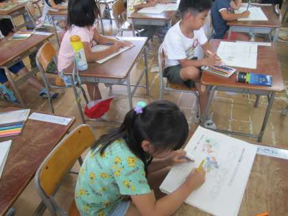 明日からはじまる夏休みのことをお友達と楽しそうにお話しながら、色えんぴつで表紙のイラストを上手に色を塗っていました。