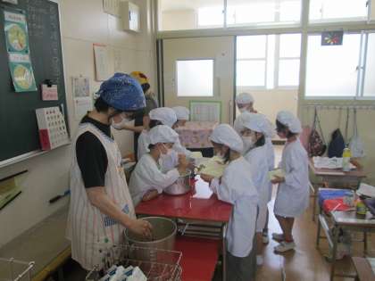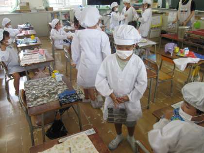 1年生の子ども達もすっかり学校生活に慣れて、給食の白衣への着替えも早くできるようになりました。給食当番のお仕事もしっかりと覚えていて、お友達と協力して配膳できます。