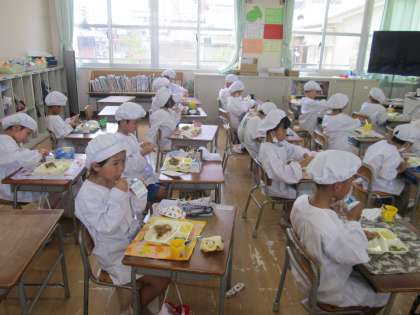 みんなで「いただきまぁす♪」と声をそろえて挨拶をして、美味しい給食をモリモリ食べました。