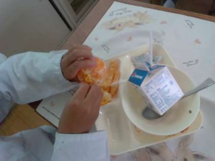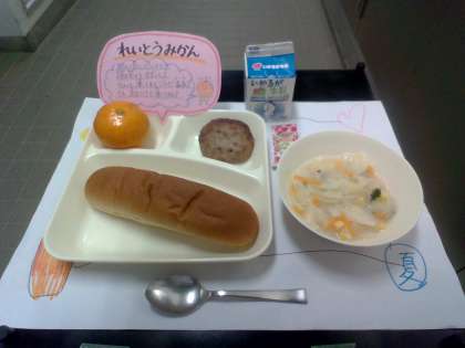今日は豆乳スープでした。あっさりとして食べやすいスープでした。そして、デザートに冷凍みかんがつきました。今日のように暑い日にはピッタリなデザートでした。「つめた〜い。」と言いながら皮をむいて食べていました。