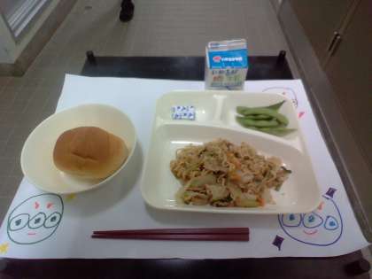 今日は「オイスターソース焼きそば、えだまめ、固形チーズ、黒糖パン1/2,牛乳」でした。