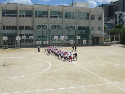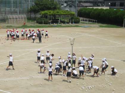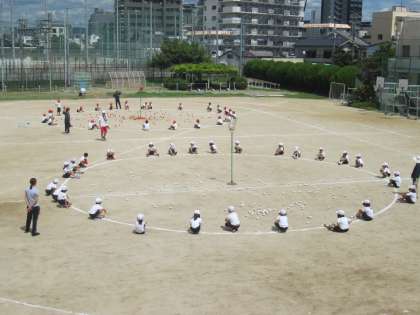 3限目、低学年の子ども達は運動場で玉入れの練習をしていました。運動場に描かれた大きな円に並んで、「ピーッ♪」という笛の合図で一斉に走って玉を拾いに行きます。低学年の子ども達からすれば遥か高くに感じるカゴめがけて、つかんだ玉を思いっきり投げ上げていきます。