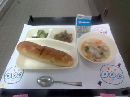 今日は「牛肉のデミグラスソース煮、スープ、きゅうりのピクルス、おさつパン、牛乳」でした。