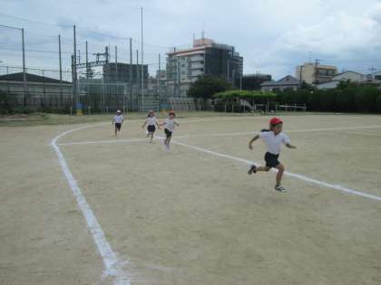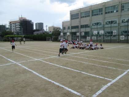 今日はくもり空。そのため昨日よりも気温がグッと下がって、暑さはやわらぎました。1年生と2年生は運動場に出て、かけっこ(徒競走)の練習をしてました。
