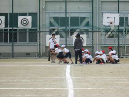 かけっこ(徒競走)の練習と言っても、ただスタートからゴールまで走ればいいというものではありません。まずは列に並んで、4人のメンバーを確認します。低学年の子ども達にとっては少し並び方が変わるだけでも大混乱です。前後のお友達や横に並ぶお友達を確かめて、整列の練習をしました。