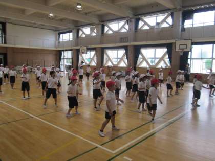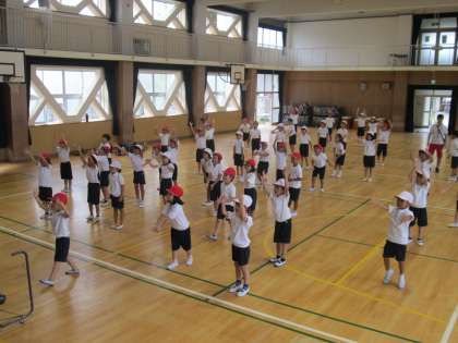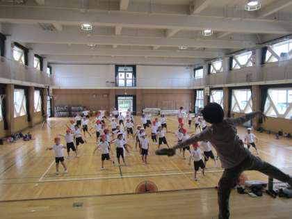 1年生と2年生の子ども達は音楽がかかると、とっても嬉しそうな笑顔でダンスをします。ステージの上の先生をお手本にして、まねっこしてステップをふんだり、ポーズを決めたり。