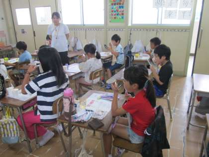 「朝、歯みがきをしてきましたか。みなさんの達に歯垢が残っているか調べてみましょう。」と歯科医の先生がおっしゃって、子ども達の前歯1本に赤い液を塗ってまわりました。水をふくんで口の中をゆすぐと、歯垢の残っているところが赤く染めだされます。2年生の子ども達は手鏡をのぞいて、歯垢の残りやすいところを確認しました。