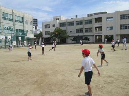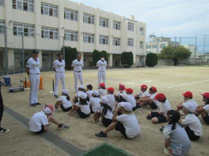 オリックス・バファローズから4人の選手の方に来ていただき、4年生で『野球教室』を開いていただきました。はじめの挨拶をして、まずはボールの取り方から教えていただきました。「高くとんできたボールは両手をお花にしてキャッチします。胸のあたりにとんできたボールは両手で小さなワニさんをつくって、パクッと食べます。転がってきたボールは両手の小指をくっつけて壁にして、ボールを止めます。」と、初心者の子にもわかりやすく教えてくださいます。