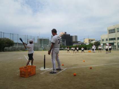 授業の後半はボールをバットで打つ練習です。ここでも、まずはボールの前の立ち方、バットの持ち方、そして遠くに飛ばすためのコツなど、選手の方がお手本をしながらわかりやすく教えてくださいました。