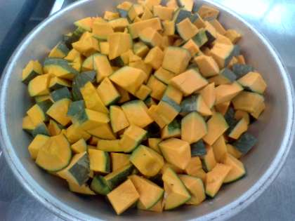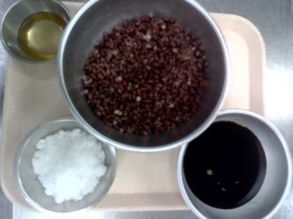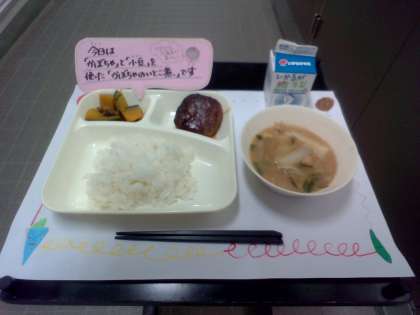 今日は「和風ハンバーグ、みそ汁、かぼちゃのいとこ煮、ごはん、牛乳」でした。和風ハンバーグはこんがりと焼いたハンバーグに手作りのソースをかけました。それと具だくさんのみそ汁、かぼちゃ(写真上)と小豆(写真中)の組み合わせのかぼちゃのいとこ煮でした。ごはんによく合い、みんなよく食べていました。