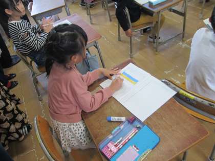 1年生の子ども達は算数で、「2本の色テープのどちらが長いか」について考えました。テープをノートに貼るときには、左の端がズレないように気を付けていました。どちらかの橋をそろえることで、正しく長さの比べっこができることを学習しました。