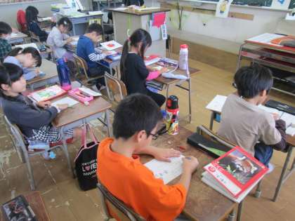 子ども達は先生が用意したプリントで、文章の中にある主語と述語を見つける問題に挑戦しました。