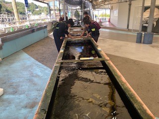 タッチプールでは、ヒトデやタコを素手で触って、「タコフニャフニャやー。」と楽しんでいます。