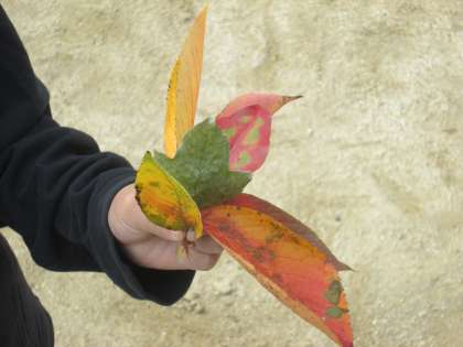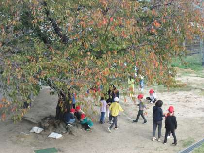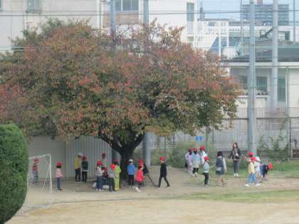 運動場の北側にある桜の大きな木は、夏の青々とした葉から、秋の色に変わりつつあります。1年生の子ども達は赤やオレンジ色になった落ち葉を拾って、大事そうに持って教室まで帰りました。