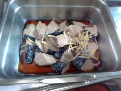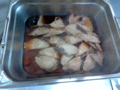 今日は「なまりぶしのしょうが煮、なめこのみそ汁、ほうれんそうのごまあえ、ごはん、牛乳」でした。なまりぶしは、しょうがの香りがよく、よく煮含めてありごはんによく合いました。なまりぶしは冷凍のもの(写真上)が届き、一クラスずつ、ミニバットに入れてしょうが、調味液を加えて(写真中)焼き物機で煮ました。(写真下)