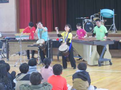 この企画の素晴らしいのは子ども達が音楽や劇を鑑賞するだけではなく、事前にワークショップに参加して芸術家のみなさんと作品をつくる体験ができることです。今回は『打楽器アンサンブル ハッチポッチクインテット』のみなさんが十三小学校に来てくださって、5年生・6年生とワークショップをしてくださいました。