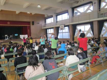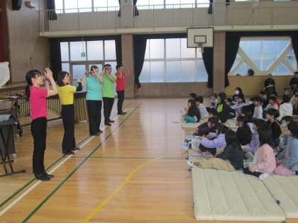 ハッチポッチクインテットのみなさんがカスタネットを持つと、1年生が音楽で使うカスタネットも魅力的な楽器に変わります。カスタネットのたたとき方も、手のひらでタンタンとたたいたり、指先でタタタンタタタンとはじいたりといろいろです。また、鳴らす場所も手だけではなく、頭や肩やおなかなど体のあちらこちらで鳴らします。