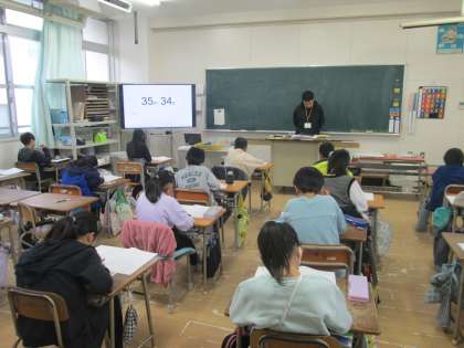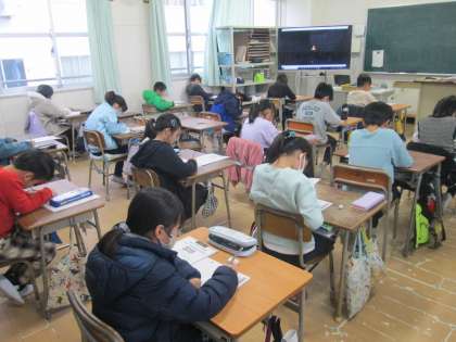 3年生の子ども達にとって、このような形式のテストを受けるのはあまり経験がないことです。1日目の最初の時間は国語のテストで、始めに文章をヒアリングで聞き取る問題に取り組んでいました。流れてくる音声に集中して、聞き取った文章の大切な言葉をメモしていました。