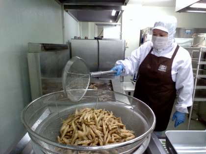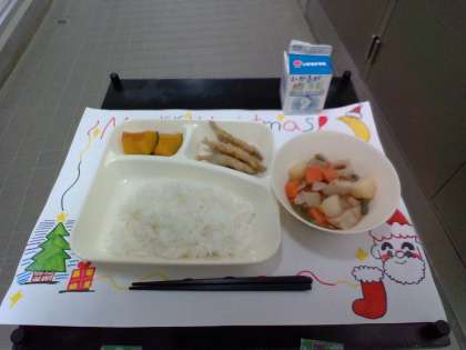 今日は「きびなごてんぷら、含め煮、かぼちゃの甘みつかけ、ごはん、牛乳」でした。きびなごてんぷらは、カラッと揚がったきびなご(写真上)にゆず果汁の入ったさっぱりとしたたれをかけました。含め煮は、だいこん、にんじん、れんこん、じゃがいも、さんどまめときれいに切裁された具材(写真中)にしっかり味が含まれ、ごはんにぴったりなおかずでした。それと冬至にちなんでかぼちゃをつかったおかずの組み合わせでした。