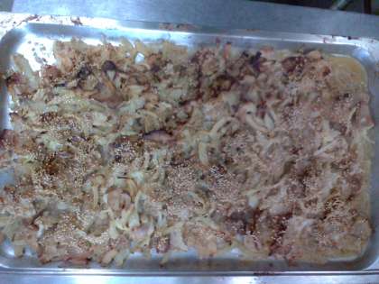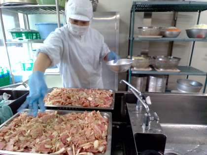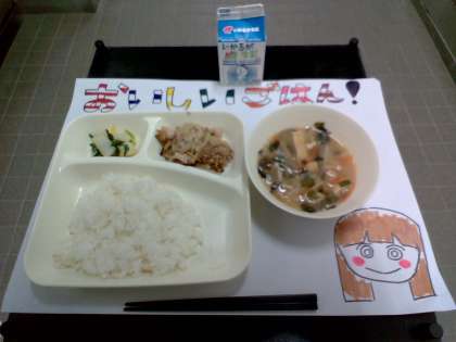 今日は「豚肉のごまだれ焼き、みそ汁、きくなとはくさいのおひたし、ごはん、牛乳」でした。豚肉のごまだれ焼きは、下味に練りごまを使い、焼く前にいりごまをかけ(写真上)、こんがり焼きました(写真中)。みそ汁は、煮干しでだしをとった赤みそと白みその合わせみそでした。おひたしは、香りの強い旬のきくなを使いましたが、はくさいを加えることで、食べやすい味になりました。