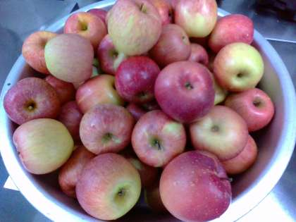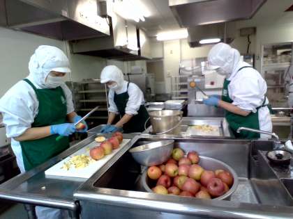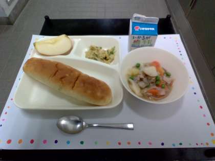 今日は「豚肉と野菜のスープ煮、カレーソテー、りんご、おさつパン、牛乳」でした。スープ煮は、豚肉を主材に、キャベツ、にんじん、じゃがいもなどたくさんの野菜などが入った具だくさんのスープ煮でした。それとささみを使ったカレーソテーは、ほんのりカレー風味で食べやすい味付けでした。今日は、デザートに季節のくだもののりんごが登場しました。長野県産のりんごでした。