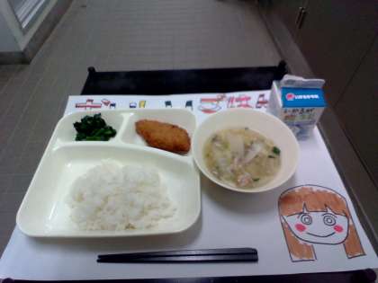 今日は「たらフライ、うすくず汁、ほうれんそうのおひたし、ごはん、牛乳」でした。