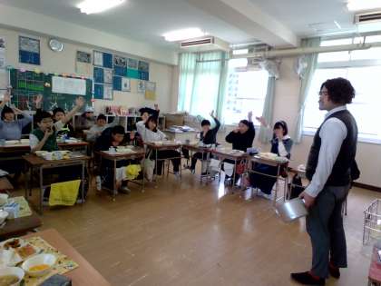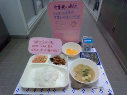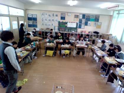6年生は、コの字になって給食を食べていました。このクラスで給食が食べられるのは、今日を合わせて、あと11日でした。