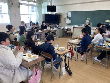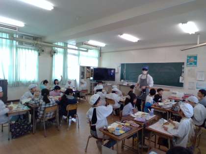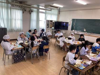 今日は「いわしフライ、みそ汁、牛ひじきそぼろ、ごはん、牛乳」でした。いわしフライはサクッと揚げられておいしく、ボリュームもあって、食べ応えがありました。みそ汁は、よく出汁がきいて、具だくさんのみそ汁でした。それとごはんによく合う、牛ひじきそぼろの組み合わせでした。そして、今日は1.2年、3.4年、5.6年と交えて給食を食べる交流給食をしました。その様子を少しですがご覧ください。