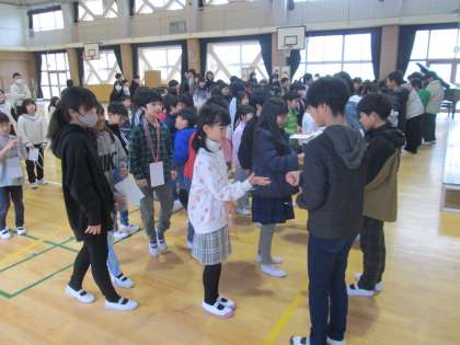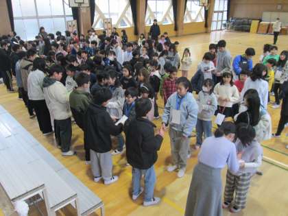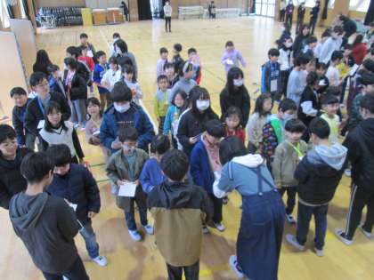 まず始めは、6年生との交流で「サイン集め」ゲームをしました。一列に並んだ6年生の前とジャンケンをして、勝つことができたら栞に6年生がサインを書いてくれます。時間のあるかぎり、次から次へと列を変え並び、6年生とジャンケンをしてサインを集めていきます。