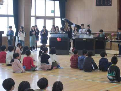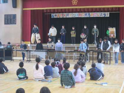 6年生が打楽器や木琴、鉄琴、オルガンで躍動感のあるリズムを刻み、5年生がリコーダーできれいなメロディーを奏でます。迫力のあるかっこいい演奏に下級生の子ども達は圧倒されて、演奏が終わると大きな拍手が講堂いっぱいに湧きおこりました。