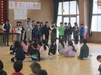 「卒業を祝う会」の最後には、6年生と5年生が一緒に合奏を披露しました。曲は先日の学習参観でも演奏した「♪情熱大陸」です。