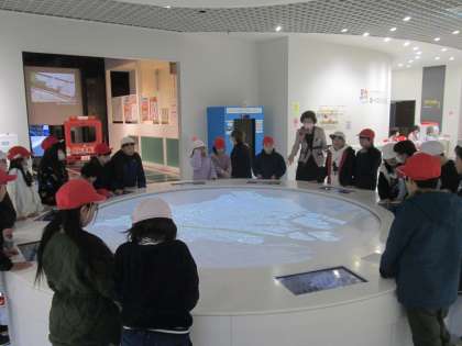 まずはエントランスにある大きな画面の周りに集まって、地震が起こるメカニズムについて説明を聞きました。また、大阪市で大きな地震が起こった時に、どの地域(区)にどのような被害が起きると想定されるのかを映像で見ました。