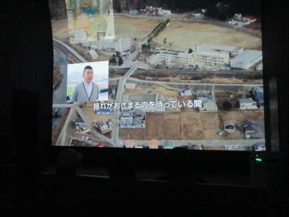 次にシアタールームに入って、東日本大震災で避難された方のインタビューの映像を鑑賞しました。実際に体験された方が、大きな地震が起こったその時に、また迫りくる津波を見た時に、どのように感じ判断して行動したのか。子ども達もいろいろなことを考えながら映像に見入っていました。