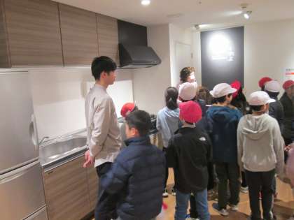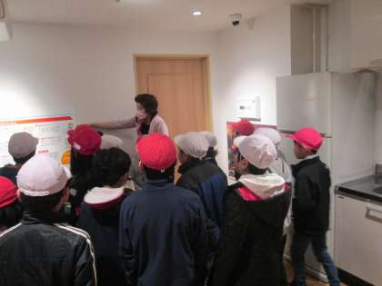 シアターを抜けた部屋は、まるで家の台所のようなセットになっていました。「地震がおさまってから、慌てずに火の元を確認してください。ガスの元栓を閉める、電気のブレーカーを落とすなど、お家に帰ったら家族の人に教えてあげてください。」と、大切なことを学びました。