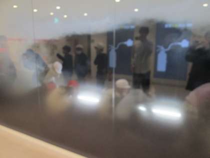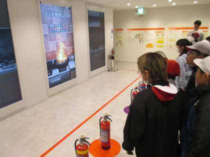 次のお部屋では消火器の使い方を教えていただきました。台所のお鍋から火が出て大きくなっていく映像に向かって、消火器のホースを向けてレバーを握ります。火の元に上手に薬品をかけることができると、しだいに火が弱まって消化できます。消火器から薬が出るのは約15秒間だそうで、その時間で火を消すのは簡単ではありませんでした。