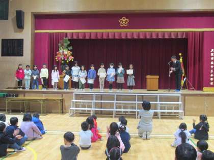 校長先生のお話に続いて、今年度の後半に読書の目標を達成した児童に『読書名人』に認定証が贈られました。中には何年間か続けて『読書名人』に認定される本好きな子もいます。次の学年に上がって、また新しい素敵な本と出合ってほしいと思います。
