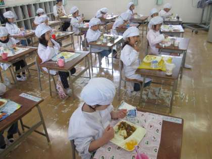 給食がそろったら、みんなで声を合わせて「いただきます!」。小学校のカレーライスを1年生の子ども達は、「めっちゃ おいしい♪」と笑顔でパクパクと食べていました。