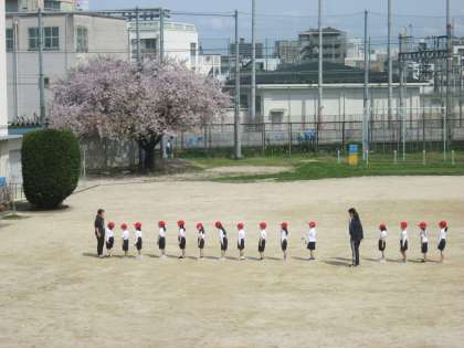 体育の授業に合わせて体操服に着替えたり、脱いだ服をたたんで机の上に重ねたりすることもできるようになりました。今日の体育では運動場に出て、2列に並ぶ練習をしました。