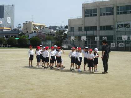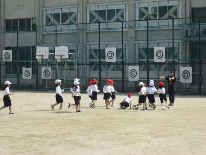 気持ちの良いお天気なので、みんなでかけっこするととっても楽しいです。1年生の子ども達が「もういっかい、もういっかい。」とリクエストするので、運動場で場所を変えてたくさん『集まれゲーム』をしました。