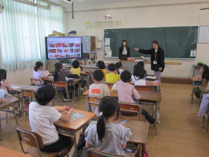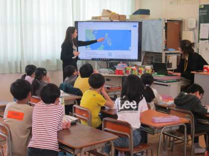 ということで、外国語活動の授業は、Anne先生の自己紹介でスタートしました。「Anne先生はどこの国から来られたでしょう?」というクイズから始まって、Anne先生のふるさと、フィリピンについていろいろ学習しました。