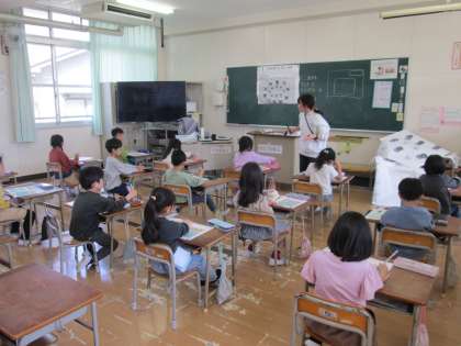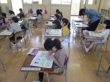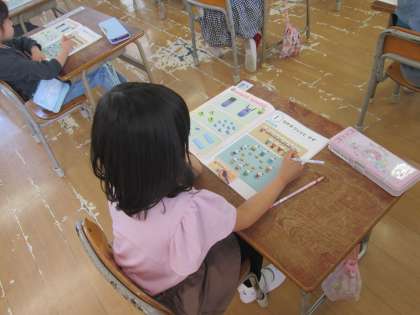 1年生も学校に慣れてきて、それぞれの教科の学習も始まっています。算数の授業では机の上に教科書を広げて、「なかまづくりと かず」のお勉強をしていました。