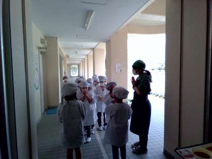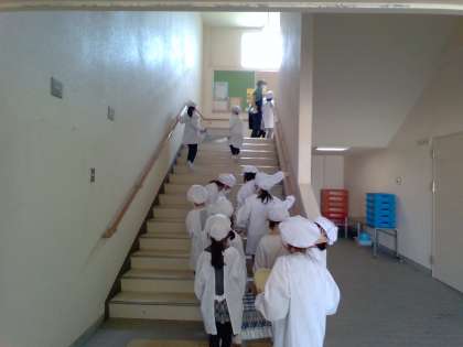 1年生は、2階まで給食を運び、給食の準備を頑張っています。よそいにくいおかずは担任の先生がよそってくれますが、運ぶのは自分たちで頑張っています。
